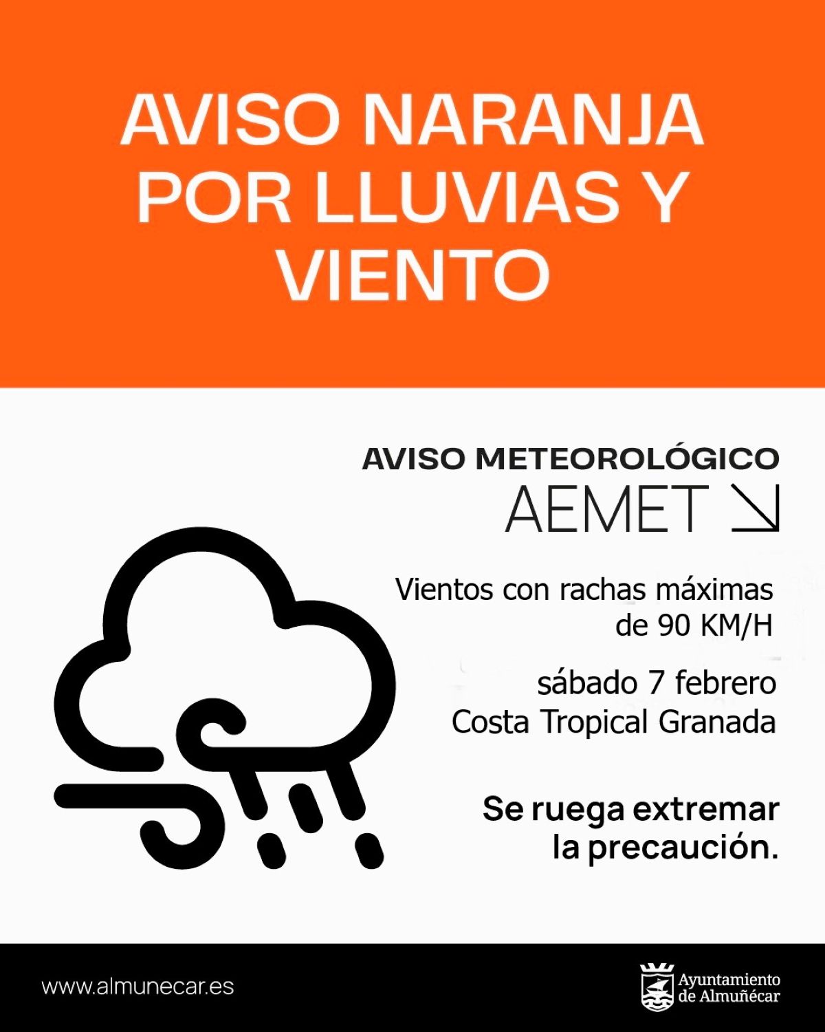 La AEMET ha establecido la alerta naranja (riesgo importante) por viento entre las 12:00 y las 21:00 horas, con rachas que podrían alcanzar hasta 90 km/h, especialmente en puntos expuestos del municipio. Este aviso ha sido trasladado por el Centro de Coordinación de Emergencias 112 Andalucía.