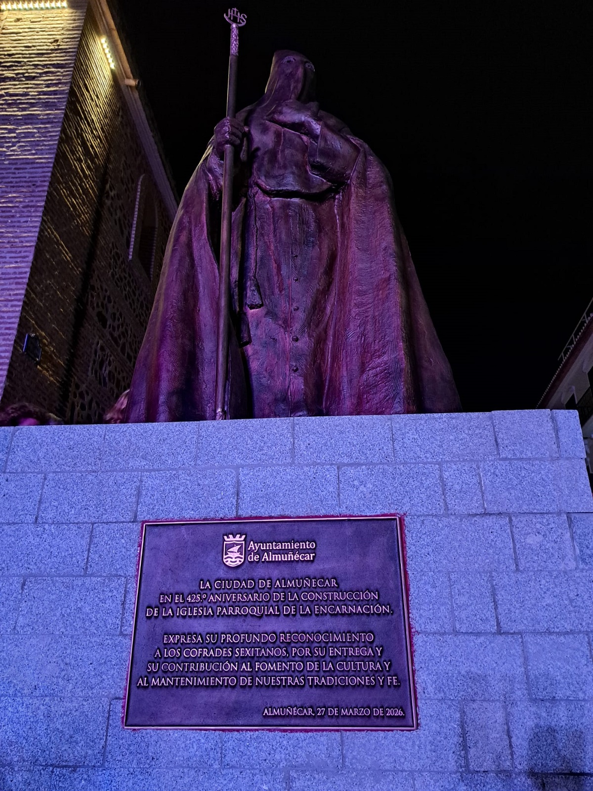 El Ayuntamiento de Almuñécar celebró anoche, Viernes de Dolores, un acto institucional en homenaje al cofrade sexitano con el descubrimiento del monumento al cofrade, una escultura que ya luce en el entorno de la iglesia parroquial de la Encarnación como reconocimiento a la tradición de la Semana Santa local.