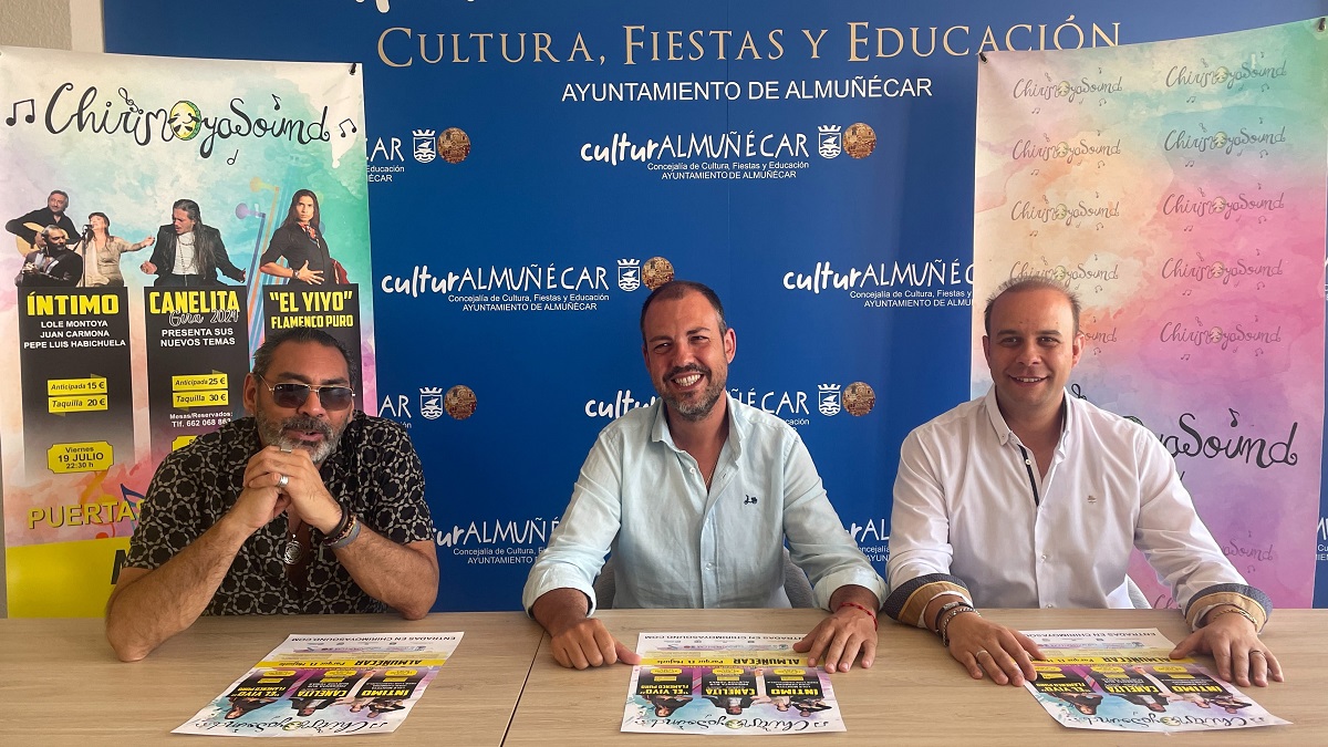 El concejal de Cultura del Ayuntamiento de Almuñécar, Alberto García Gilabert, acompañado por Pepe Luis Habichuela y el promotor sexitano de flamenco, Antonio de la Flor, han presentado una nueva edición del ‘Chirimoya Sound’ que tendrá lugar en el parque el Majuelo del 19 al 21 de julio y que trae a Almuñécar tres de los mejores espectáculos de flamenco del momento.