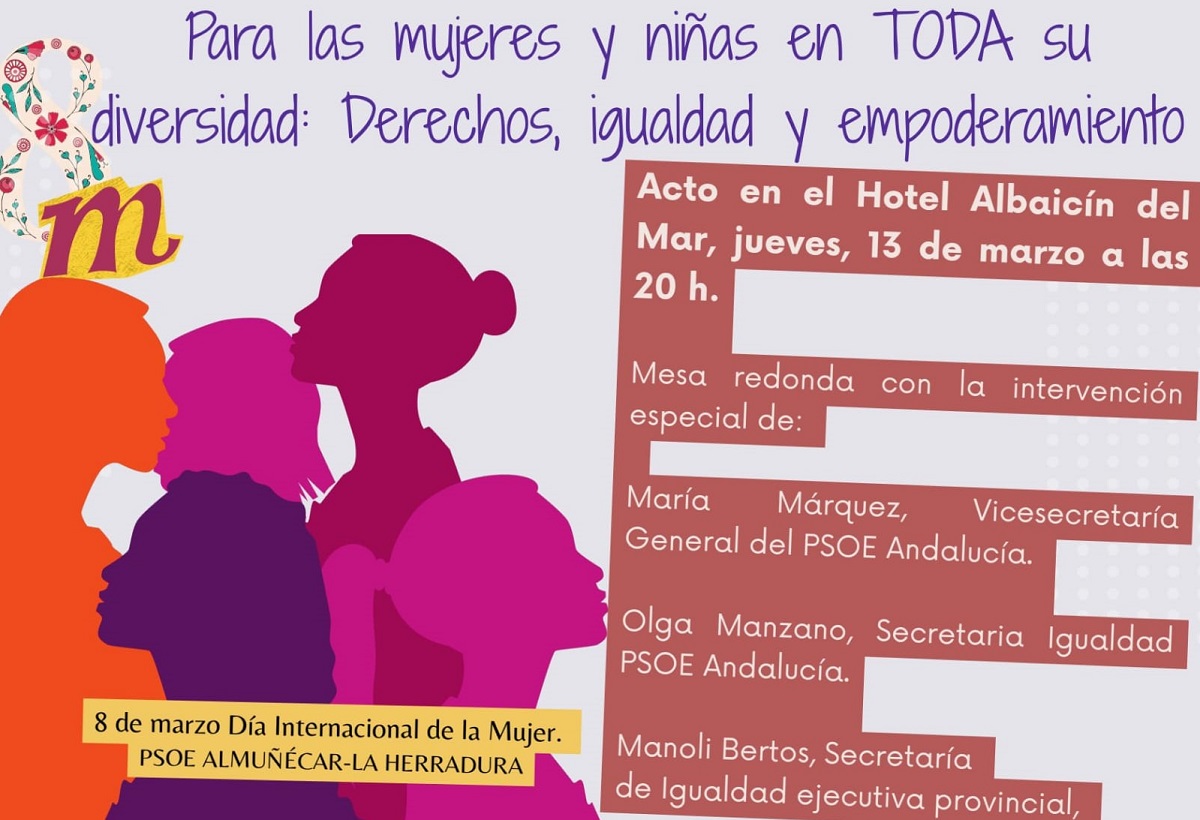 Mujeres, van a celebrar los socialistas en el Hotel Albaicín del Mar el próximo jueves 13 de marzo (20.00 horas) y para el que se ha anunciado la presencia de la vicesecretaria general del PSOE de Andalucía, María Márquez; la secretaria de Igualdad del PSOE de Andalucía, Olga Manzano; y la secretaria de Igualdad de la Ejecutiva Provincial, Manoli Bertos.