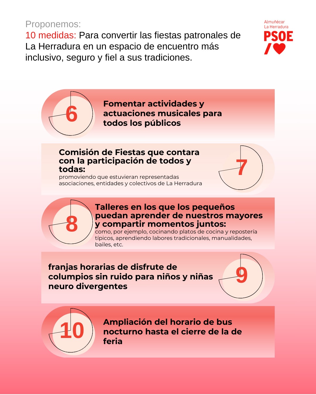Entre las medidas planteadas, el PSOE propone ampliar los horarios y la frecuencia del transporte urbano entre Almuñécar y La Herradura, así como mantener el servicio nocturno hasta el cierre de la feria de noche. Según indican, esta medida contribuiría a reducir la saturación de aparcamientos y a facilitar desplazamientos más seguros. También plantean habilitar zonas públicas de estacionamiento con plazas específicas para personas con movilidad reducida.