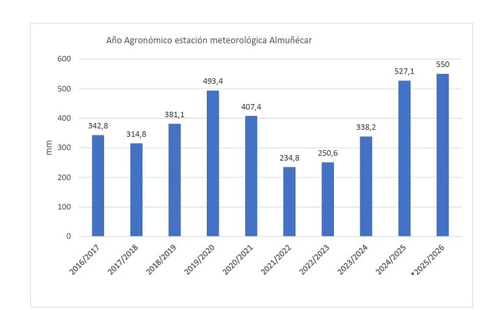 La abundante lluvia registrada en Almuñécar en lo que va de 2026 asegura la recarga del acuífero municipal para todo el año y supone una noticia muy positiva para la agricultura local, especialmente para los cultivos tropicales. Así lo ha destacado el concejal de Agricultura del Ayuntamiento de Almuñécar e ingeniero agrónomo, Carlos Ferrón, a partir de los datos de la estación agroclimática situada en la depuradora de Río Verde.