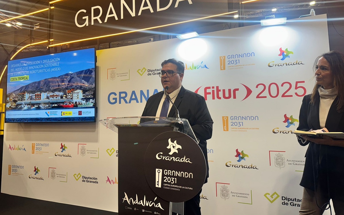 El presidente de la Mancomunidad de Municipios de la Costa Tropocal, Rafael Caballero, junto a la directora de proyectos de Segittur, Olga Pérez, ha presentado, en la Feria Internacional de Turismo de Madrid, FITUR 2025, un proyecto innovador que pretende impulsar la creación de un Modelo de Innovación Sostenible de Experiencias Agroturísticas (MISEA), destinado a la creación de experiencias turísticas vinculadas con el sector primario en nuevos destinos de la Red de Destinos Turísticos Inteligentes.