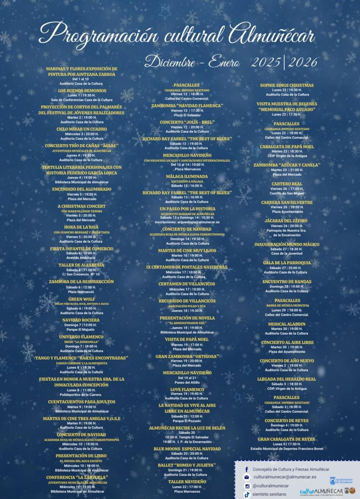 Entre los eventos programados figuran la Navidad Rociera en El Majuelo, los conciertos de Blue Moons Especial Navidad, los recitales de la Academia Rusa de Música Elena Farkhutdinova, la llegada de la Luz de Belén, diversos pasacalles musicales y espectáculos familiares en la Casa de la Cultura.